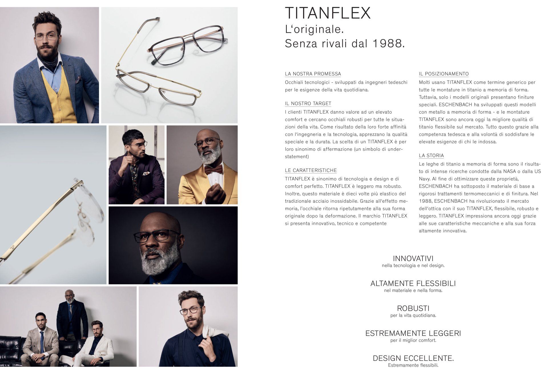 Inoltre, questo materiale è dieci volte più elastico del tradizionale acciaio inossidabile. Grazie all‘effetto memoria, l’occhiale ritorna ripetutamente alla sua forma originale dopo la deformazione. Il marchio TITANFLEX si presenta innovativo, tecnico e competente.